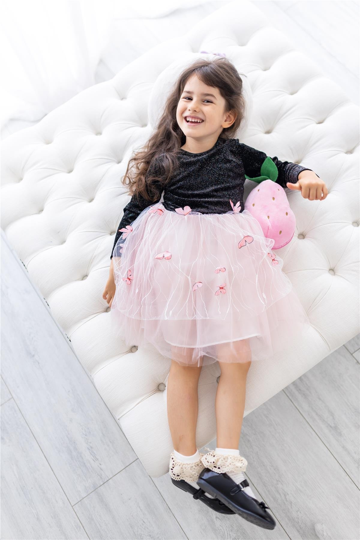 Simli kadife kumaş, üst beden kabarık 3 boyutlu kelebekli etek özel günlerinizin yıldızı olmaya hazır.