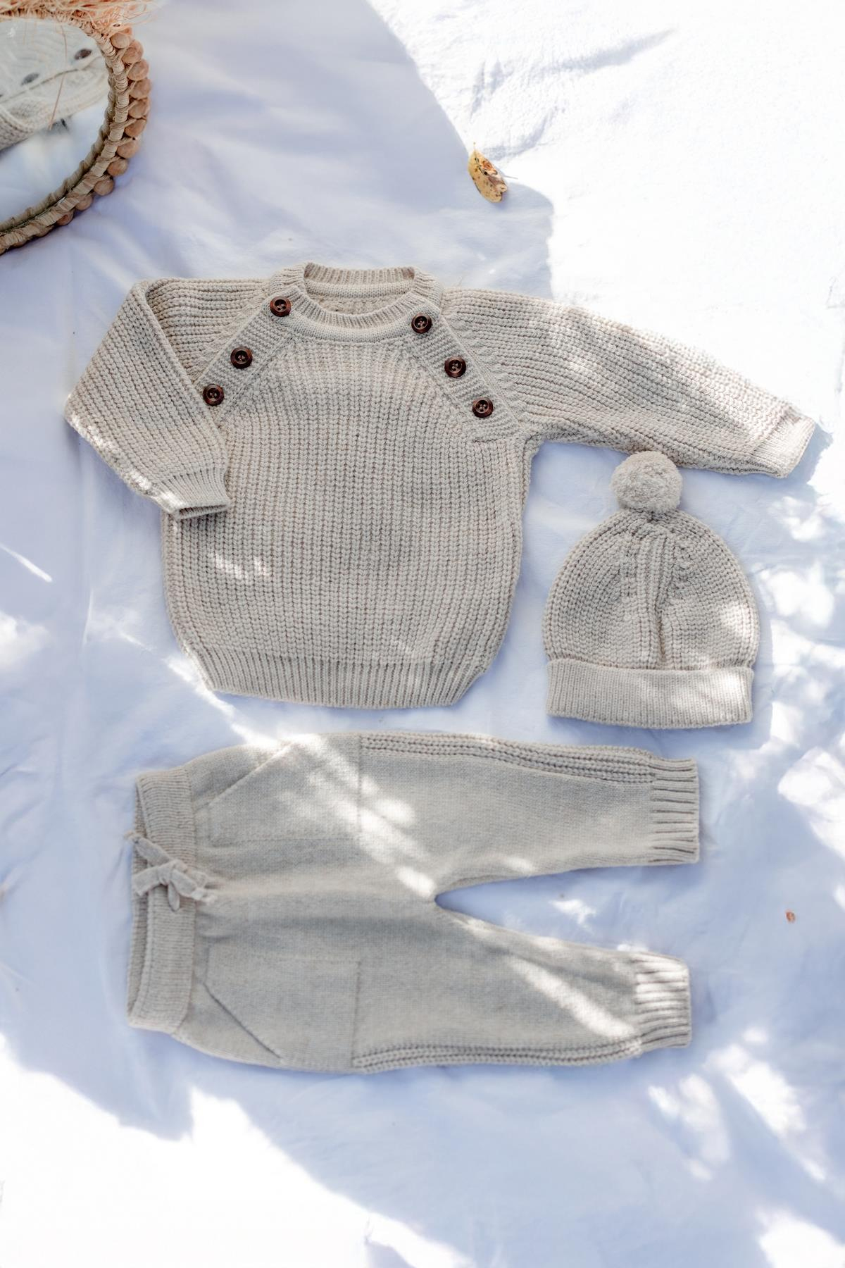 Ahşap düğmeli hırka pantolon ve bereden oluşmaktadır.