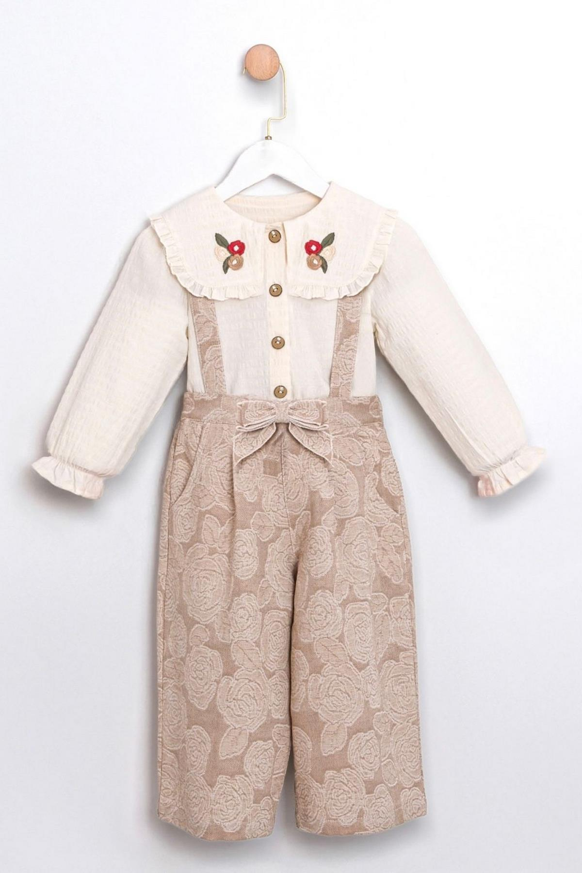 Çiçek Nakışlı Gömlekli Askılı Bej Pantolon Takım 🌷